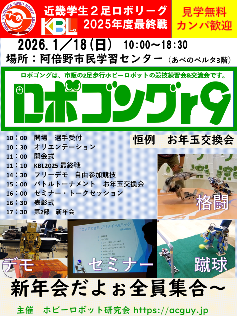 KBL2025最終戦 & ロボゴングr9 2025年10月25日 に admin が投稿 — コメントはありません ↓ 日時 2026年1月18日 日曜日 10時〜19時30分場所 大阪市あべの市民学習センター (大阪メトロあべの駅直結)